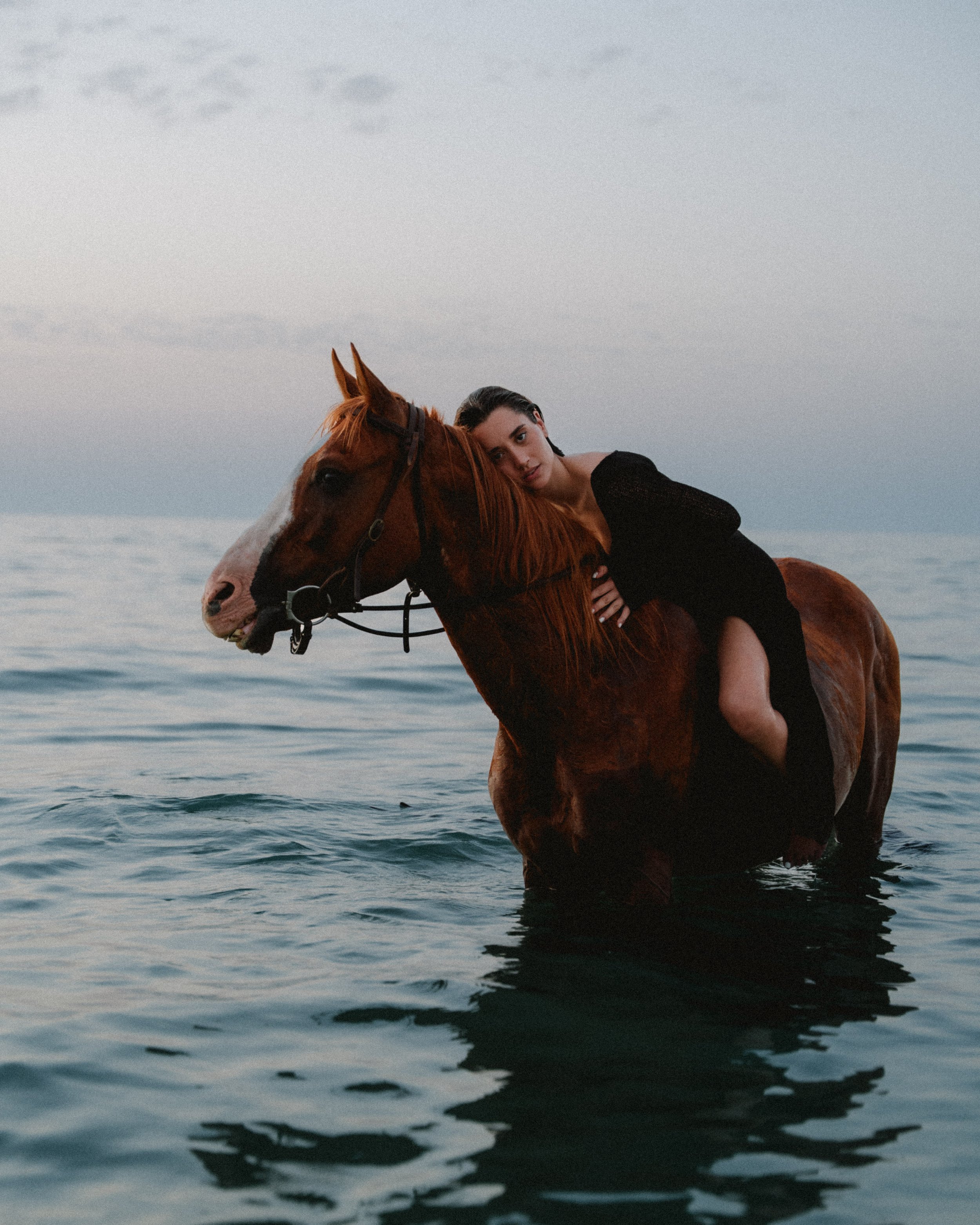 Puis, la magie s’est déplacée vers la mer : chevaux et modèle plongés dans l’eau ont donné naissance à des images puissantes et évocatrices, pensées pour inspirer aussi bien dans un cadre artistique que commercial.